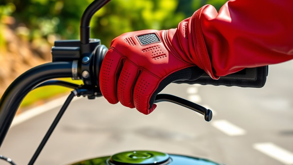 To guarantee ideal control and safety while riding, it’s essential to pay attention to how well your motorcycle gloves grip the handlebars. Gloves with textured or silicone-coated palms markedly enhance grip, preventing slips during quick maneuvers or wet conditions. Reinforced palms and finger pads add extra security, offering better traction and reducing the risk of losing control. Touchscreen-compatible fingertips allow me to operate devices without removing my gloves, maintaining focus and control. Proper fit is critical—gloves that fit well won’t bunch or slip, which helps reduce fatigue on long rides. Non-slip materials and gel padding in the palm area improve traction and absorb shocks, giving me better handling and comfort. These features collectively guarantee I stay confident and in control every time I ride.