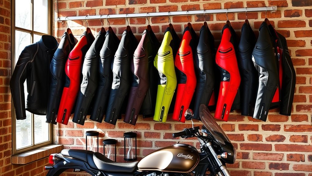 Choosing the right motorcycle jacket goes beyond style and fit; it also involves understanding care and maintenance requirements to guarantee longevity and safety. Most jackets require specific care instructions—think hand washing or dry cleaning—to keep their fabric integrity and protective features intact. If you opt for leather, remember it needs conditioning and special cleaning products to prevent cracking. Textile and waterproof jackets often have removable liners that should be cleaned separately, so always follow manufacturer guidelines. Regularly inspect zippers, seams, and armor pockets to ensure everything’s working as it should. Finally, store your jacket in a cool, dry place away from direct sunlight to help prolong its lifespan and maintain its protective qualities.