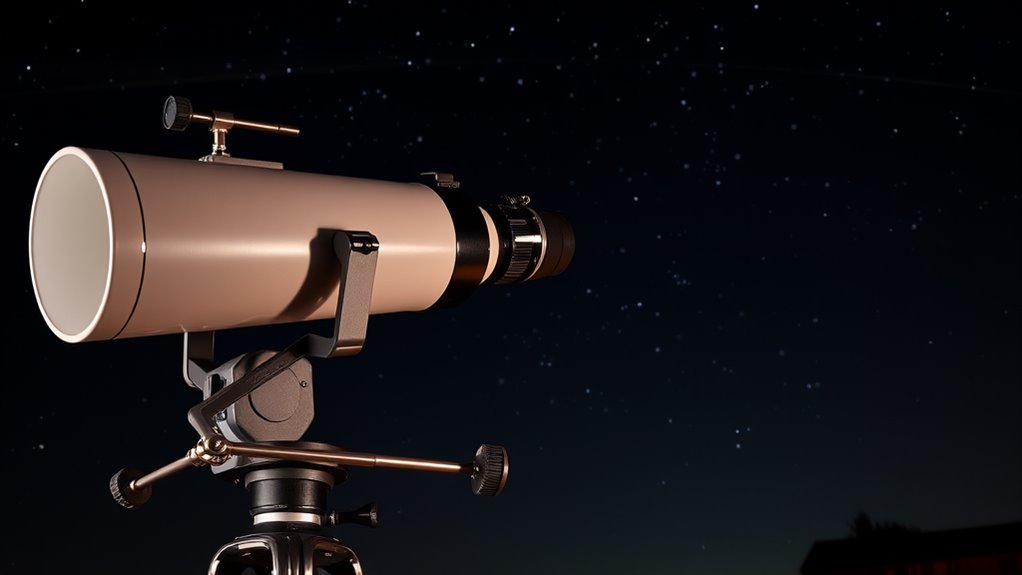 When selecting a motorized alt-az mount, considering its optical support capabilities is essential for a satisfying viewing experience. I look for mounts that support a range of eyepiece sizes, like 1.25-inch and 2-inch, to maximize versatility. Integrated ports, such as SNAP or shutter release connections, are key for attaching cameras or DSLRs, expanding my astrophotography options. High-quality mounts feature borosilicate mirrors with quartz overcoats and metallic coatings, providing sharp, contrast-rich views of planets and the Moon. The optical tube length and focal ratio influence how well the mount handles higher magnifications and astrophotography. Compatibility with accessories like diagonals and filters also matters, allowing me to optimize image quality and explore different observational techniques.