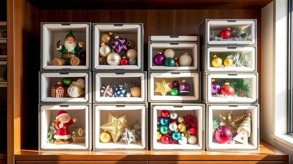 When selecting a drop-proof ornament storage box, I always prioritize durability and ease of access—think of it as my modern-day armor for precious decorations. With options like waterproof shells and adjustable dividers, I feel confident my ornaments will stay safe, even if I accidentally drop the box. Just like the sturdy chests of yore, these containers keep my treasures secure, ensuring I can enjoy my holiday decor without a worry—no matter if I’m in a castle or a cozy home.