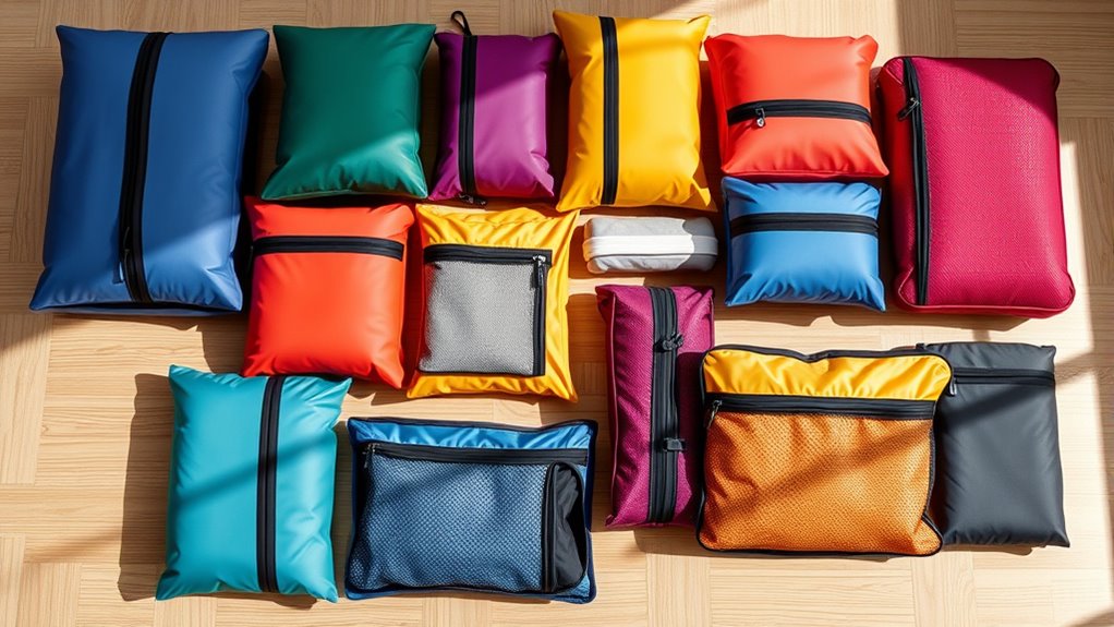 Have you ever struggled to fit all your belongings into your luggage? The right packing cubes can make a huge difference. They come in various sizes, from small pouches for underwear to large cubes for bulky clothing. Choosing a set with multiple capacity options helps you organize better by categorizing items based on size and type. Larger cubes are perfect for sweaters, jackets, or bulkier items, while smaller ones are great for accessories, socks, or cosmetics. Picking the right sizes guarantees you maximize space without overpacking or wasting room. Sets that include a range of sizes allow you to customize your packing system, making it easier to access specific items during your trip. This flexibility keeps your luggage neat and accessible.