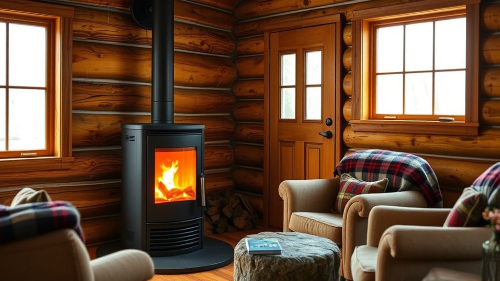 Ensuring your pellet stove meets emissions standards is essential for both environmental responsibility and health, especially in off-grid cabins where ventilation may be limited. I recommend choosing an EPA-certified stove, as this guarantees it meets strict emissions standards and reduces pollutants like particulate matter and carbon monoxide. Verify that the stove complies with local regulations to avoid legal issues and protect air quality. Look for models with advanced combustion technology that minimizes emissions during extended burn cycles, which is critical in enclosed or poorly ventilated spaces. Certifications or labels indicating adherence to national or international standards are a good sign of quality. Prioritizing emissions compliance not only helps the environment but also guarantees safer, cleaner air inside your cabin.