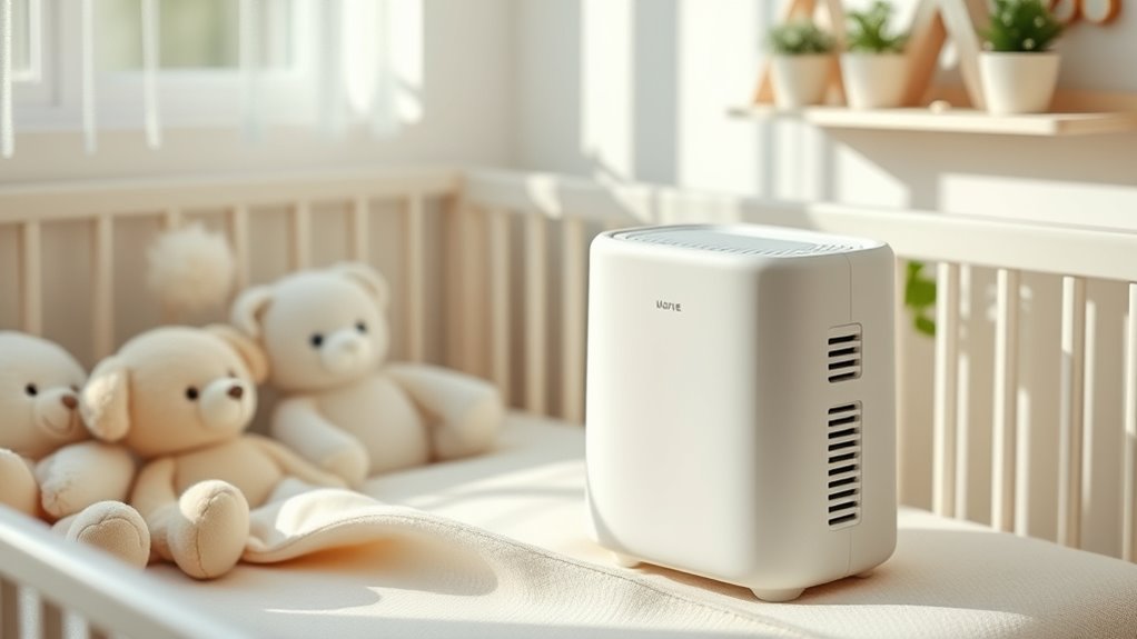 I know odors can make a nursery feel less fresh, but yes, portable air purifiers can definitely help. They’re equipped with activated carbon filters that absorb and neutralize smells from diapers, pets, or cooking. I love how they quietly improve air quality, making the space more inviting for my little one. It’s reassuring to know that a simple device can keep the nursery smelling clean and fresh every day.