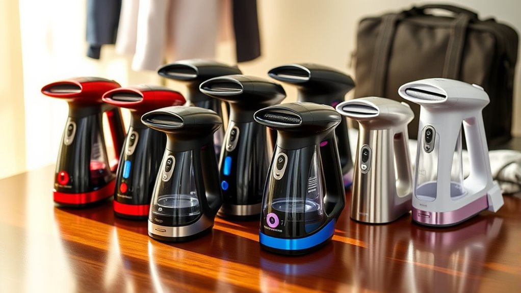 Looking for the best portable garment steamers for travel in 2025? I’ve found top models that are lightweight, heat up fast, and deliver powerful steam to keep your clothes wrinkle-free on the go. From compact designs with dual voltage options to accessories like brushes and fabric spacers, these steamer options suit various fabrics and needs. If you want to discover more about their features and which one fits your travel lifestyle, keep exploring.