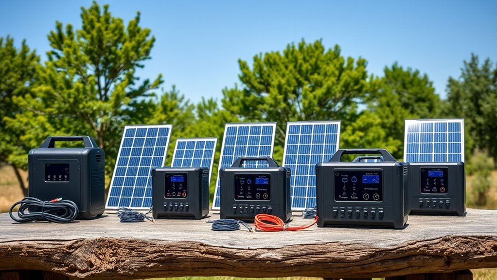 Recharging options are a key factor in selecting the right portable solar generator kit because they determine how quickly and reliably I can restore power in different situations. You can recharge these generators via AC wall outlets, solar panels, or vehicle cigarette lighter ports, offering flexibility for various scenarios. The efficiency of solar recharging depends on the solar panel’s wattage and quality, with higher wattage panels providing faster recharge times. Some units feature MPPT controllers, which optimize solar input for maximum power, making recharging more efficient. Recharging times vary from as quick as 1.7 hours with fast-charging wall adapters to 6-8 hours or more with solar panels, depending on sunlight conditions. Properly matching panel wattage and ensuring good sunlight exposure are essential for effective recharging.