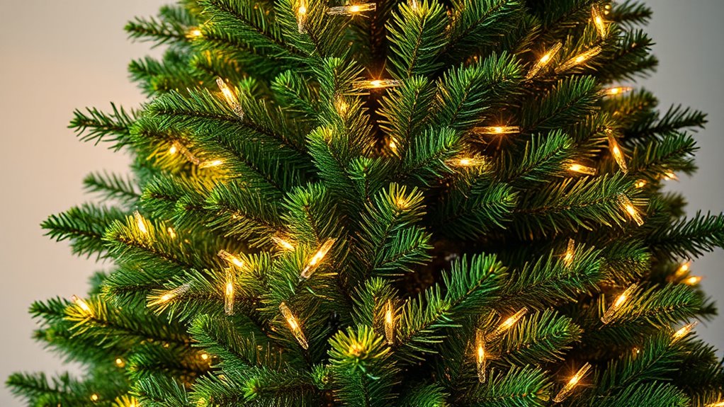 Since the appearance and feel of PE needles greatly influence how realistic a pre-lit Christmas tree looks, choosing high-quality materials is essential. High-quality PE needles are made from durable, flexible plastic that closely mimics real pine or fir needles, enhancing authenticity. The density and layering of these tips are vital; well-designed trees feature a natural fullness and silhouette that resemble real branches. Premium PE needles often have varied tip shapes and sizes, replicating the uneven growth patterns found in nature. Additionally, quality needles are UV resistant and colorfast, ensuring they stay vibrant over multiple seasons. Safety features like flame retardancy and hypoallergenic properties are common in top-tier options without sacrificing realism, making these trees both beautiful and safe for your home.