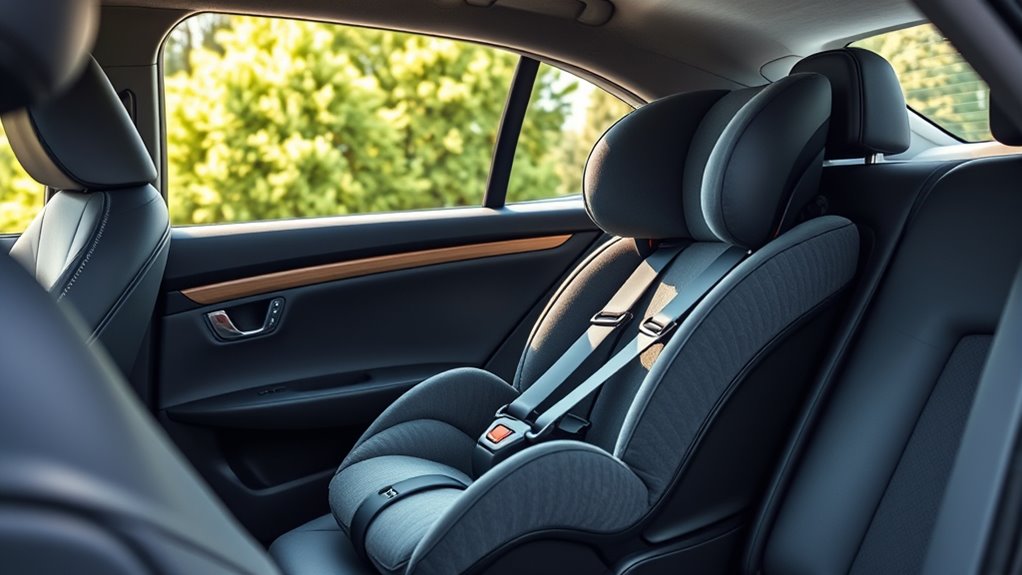 When selecting a premium all-in-one car seat, comfort and padding are essential for keeping your child happy and secure on every trip. Adequate padding and plush materials guarantee your child stays comfortable during long rides and help prevent pressure points. Removable and washable covers make it easy to keep the seat clean and hygienic, maintaining a cozy environment. Adjustable headrests and harness pads allow for a customized fit as your child grows, providing extra cushioning and support. Well-padded side wings and impact-absorbing foam enhance safety while offering added comfort during side-impact collisions. Multiple recline positions with soft padding support proper positioning, ensuring your little one remains comfortable in various seating modes. Prioritizing these features creates a safer, more enjoyable ride for your child.
