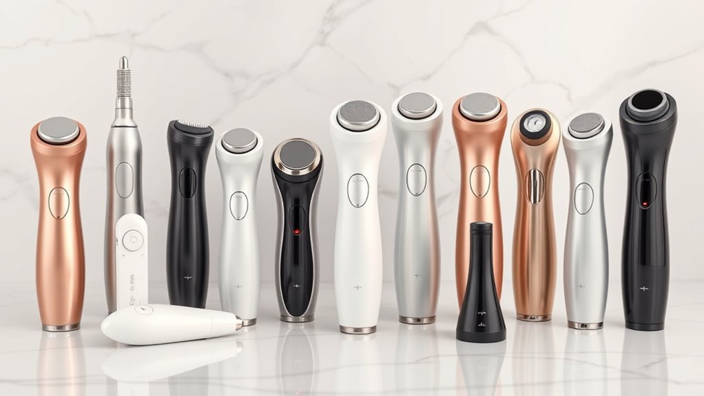Selecting a device that matches your skin type is essential to avoid irritation and achieve ideal results. Whether you have sensitive, oily, dry, or combination skin, choosing the right device helps prevent adverse reactions. Look for options with adjustable intensity levels so you can customize treatments to your skin’s tolerance. Technologies like RF, microcurrent, or LED therapy are often safe and effective for specific skin concerns, but verify they suit your skin type. Features like cooling or soothing modes are especially helpful if you have sensitive or redness-prone skin. Ultimately, reading user feedback for your skin type can give you real-world insight into how well a device works for others with similar skin, guiding your choice toward safer, more effective results.
