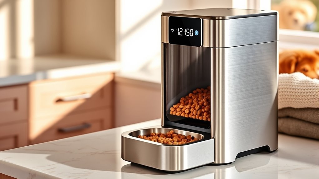 Automatic feeders handle dietary restrictions and special diets by allowing me to program precise portion sizes and set specific feeding times. I can use compatible containers or compartments to separate special foods or medications. Some advanced models even connect to apps, letting me customize meals for each pet based on their unique needs. This way, I guarantee my pets stick to their diets effortlessly, even when I’m busy.