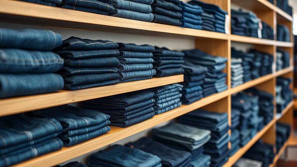 Premium denim brands guarantee sustainable manufacturing by using eco-friendly materials like organic cotton and recycled fibers. I’ve noticed they also implement water-saving techniques, reduce chemical use, and prioritize fair labor practices. Brands often partner with factories that follow strict environmental and ethical standards. By transparency and innovation, they aim to minimize their carbon footprint and promote sustainability, so I can feel good about supporting brands that care for the planet and workers alike.
