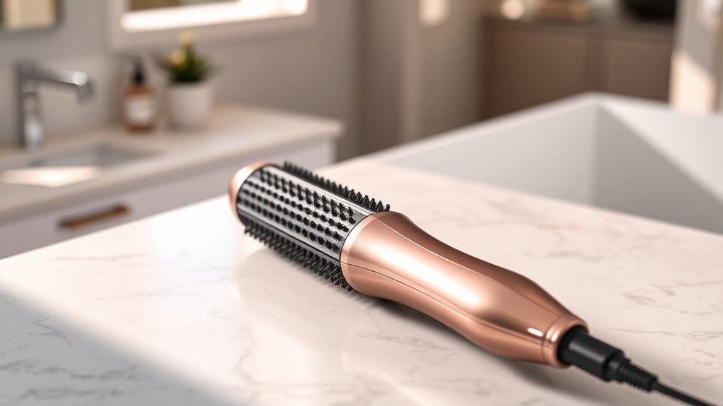 When selecting a premium hair straightening brush, prioritizing safety features is essential to protect both your hair and your well-being. Modern brushes often include automatic shut-off systems that turn off after 60 minutes of inactivity, reducing overheating risks. Cool-tip technology and side bristles help prevent burns and scalds, allowing safe styling at any angle. Anti-scald handles and heat-lock technology maintain consistent temperatures, minimizing accidental burns during use. Dual voltage compatibility and travel pouches ensure safe, reliable operation worldwide, reducing electrical hazards. Additionally, regular safety testing and certifications like UL or CE approval confirm that the brush meets rigorous safety standards. These features give me peace of mind, knowing my styling routine is both effective and secure.