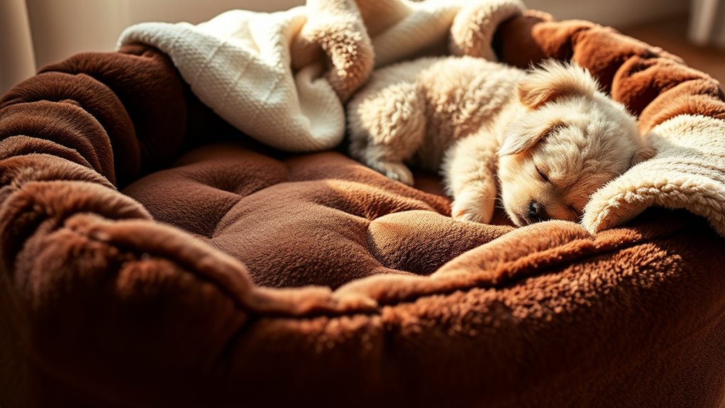 Matching the size of a heated pet bed to your pet’s specific needs guarantees they stay comfortable and secure. It’s essential to select a bed with dimensions that fit your pet’s size, so they won’t slip or feel cramped. Measure your pet’s length and width while they’re seated or lying down to find the right fit—whether they prefer to stretch out or curl up. For growing pets like puppies or kittens, consider beds with adjustable or customizable sizes to keep up with their growth. Look for designs with raised sides or contours that support key areas, such as the head and neck, for added comfort. Most importantly, choose a size that allows enough space for movement, ensuring your furry friend can rest naturally and comfortably.