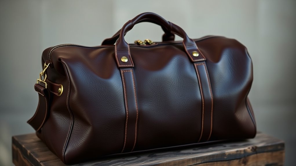 Choosing the right leather material is essential because it directly influences a duffle bag’s durability and appearance over time. I recommend full-grain or top-grain leather, as these are the highest quality options, ensuring a premium look and lasting strength. The thickness and treatment of the leather matter; thicker, vegetable-tanned leather typically offers greater longevity and develops a beautiful patina with use. Reinforced stitching, sturdy hardware like YKK zippers, and solid metal fittings also enhance durability, preventing wear and tear during frequent trips. High-quality leather ages gracefully, gaining character and charm over years. Proper craftsmanship—precise seams and rigorous quality control—ensures the leather maintains its integrity and aesthetic appeal, making your investment worthwhile for both style and resilience.