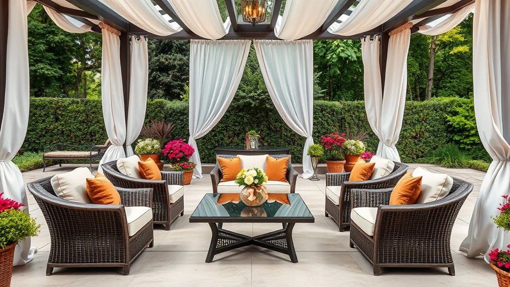 Choosing patio furniture that matches your outdoor space’s style can transform your patio into a welcoming retreat. I look for pieces that complement my existing decor, whether it’s modern, rustic, or traditional, to create a cohesive look. Color palette and material finishes, like wicker, metal, or resin, help reflect my personal aesthetic and suit the environment. Design details such as armrest shape, cushion patterns, and table style contribute greatly to the overall vibe and visual appeal. Aesthetic features like sleek lines, decorative accents, and coordinated colors enhance harmony, making the space feel inviting and polished. When the furniture style aligns with my outdoor theme, it results in a unified, attractive environment that truly feels like an extension of my personal taste.