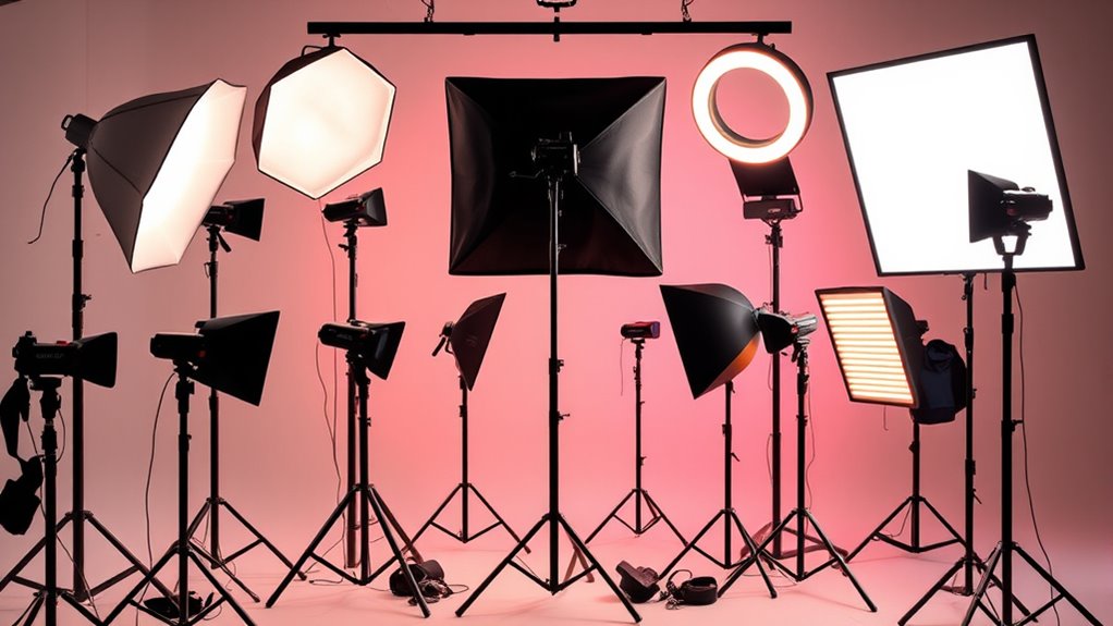 If you’re looking for the 15 best premium studio lighting kits for professional-quality photos, I recommend options that offer soft, versatile light, adjustable color temperature, and easy setup. These kits include softboxes, LED or CFL bulbs, sturdy stands, and useful accessories like backdrops and diffusers. They’re perfect for portraits, product photography, or streaming. Stay with me, and you’ll discover all the features and top picks to elevate your photography game.