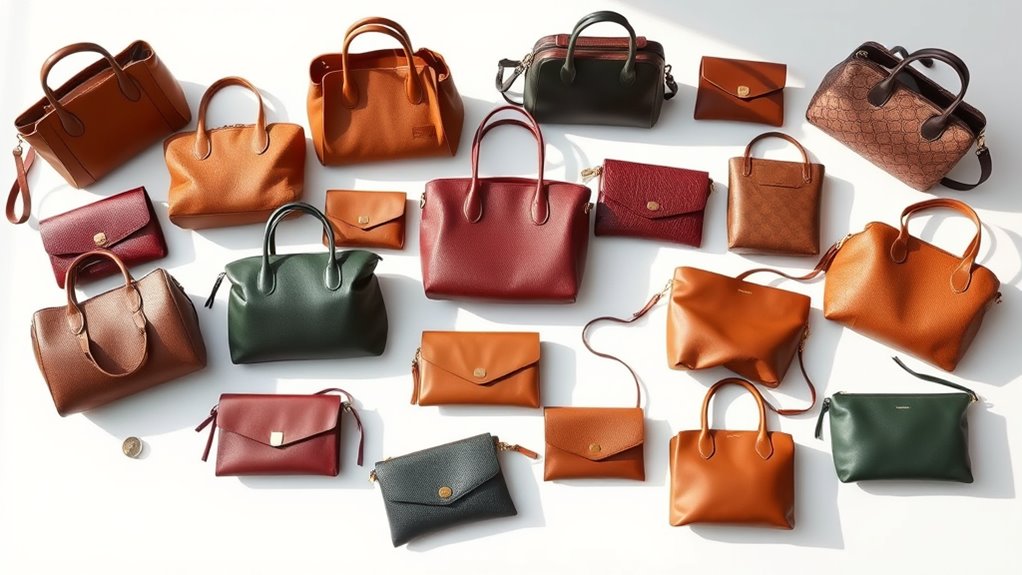 Opting for a vegan leather handbag with versatile carrying options can considerably enhance its functionality and style. Many of these bags feature detachable or adjustable straps, allowing me to switch seamlessly between shoulder, crossbody, or handheld styles. Some designs incorporate both long straps and top handles, making it easy to switch from casual to formal looks in seconds. Adjustable straps guarantee a comfortable fit for different heights and preferences, adding to the bag’s practicality. Multi-strap configurations boost usability, making the handbag suitable for work, travel, or casual outings. Pockets and compartments, strategically placed for easy access, work perfectly with these strap options, helping me stay organized without sacrificing style. Overall, versatile carrying options make a handbag truly adaptable to my daily needs.