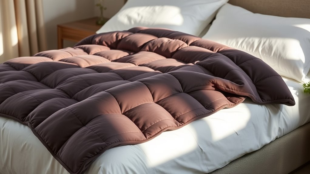 Selecting the right weighted blanket involves more than just material quality; getting the weight and size right is key to maximizing comfort and benefits. The ideal weight is usually 7-10% of your body weight, ensuring the blanket provides enough pressure without feeling overwhelming. Proper sizing is equally important—aim for a blanket that fully covers your body without hanging over the edges, which can reduce its therapeutic effects. Smaller blankets may target specific areas, but larger ones offer full-body support and help prevent shifting during sleep. If the blanket is too heavy or too light, it can compromise comfort and lessen sleep benefits. Finding the right fit ensures even weight distribution, helping you relax deeply and wake up refreshed.