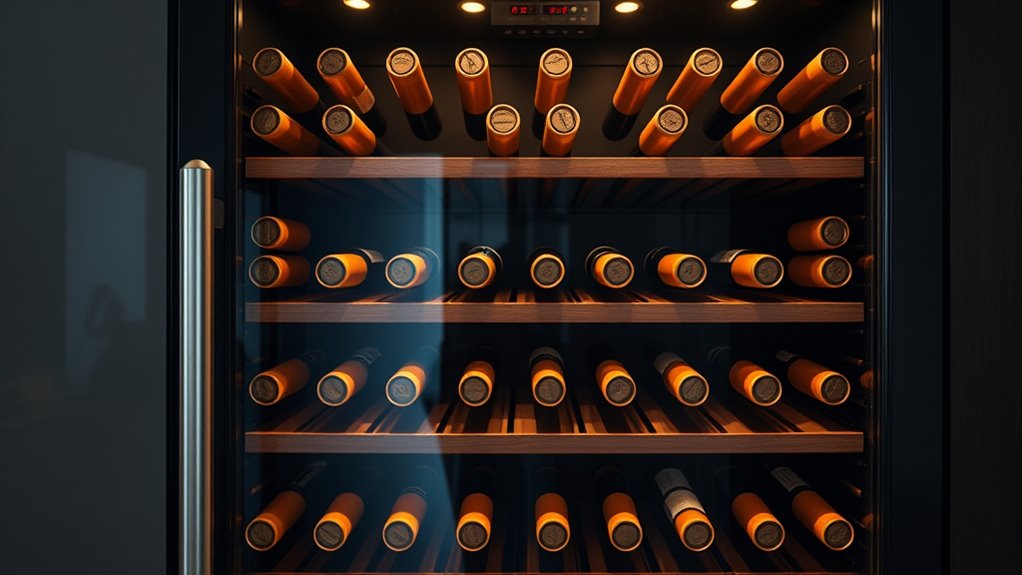 Lighting and visibility play a crucial role in showcasing your wine collection and making selection easier. Proper LED interior illumination enhances visibility of labels and organization without emitting UV rays that can harm wine quality. Glass doors with UV protection safeguard your bottles from light-induced deterioration while still allowing you to admire your collection. Adjustable brightness and color options let you create an inviting display and highlight specific wines or collections. Clear, well-lit shelving arrangements facilitate quick identification and effortless selection, especially in extensive collections. Low-heat lighting solutions are essential to prevent temperature fluctuations that could disrupt the wine’s aging process. Overall, thoughtful lighting and visibility features not only protect your wines but also enhance the aesthetic appeal of your cellar.