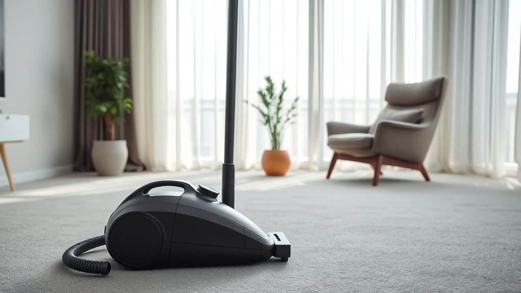 Balancing suction power is essential for selecting a quiet canister vacuum that still delivers effective cleaning. A good balance ensures your vacuum performs well without creating excessive noise or disturbing your neighbors. Typically, a suction level of around 28-32 kPa provides enough force to clean most surfaces while keeping noise low. Too much suction can make the vacuum louder and risk damaging delicate surfaces, so finding a middle ground is key. Many models feature adjustable suction settings, allowing you to turn down power for light cleaning or boost it for tougher debris. Maintaining this balance not only keeps noise levels in check but also prevents overworking the motor, helping your vacuum last longer and operate quietly over time.