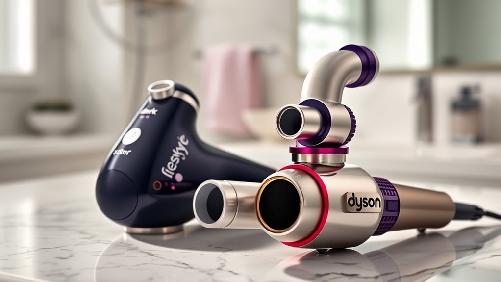 Have you ever wondered how precise heat control impacts your styling results? It’s pivotal because consistent temperatures help prevent heat damage, keeping your hair healthy. Modern devices feature digital displays and adjustable settings, so you can customize heat levels to suit your hair type—whether fine, thick, or curly. Some models even include advanced sensors that automatically regulate heat, maintaining the ideal temperature throughout styling. Plus, intelligent heat control technology detects hair moisture levels and adjusts heat accordingly, ensuring gentle yet effective styling. Accurate heat regulation not only protects your hair but also enhances shine, reduces frizz, and helps your style last longer. When choosing between the Shark FlexStyle and Dyson Airwrap, consider how their heat control features align with your styling needs.