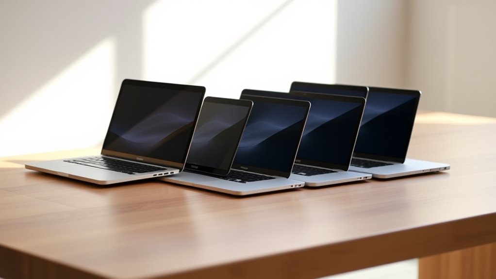 Choosing the right display size for a fanless MacBook depends on how you plan to use it on the go; a larger screen, like 15.3 inches, provides more immersive visuals but can be less portable, while a smaller 13.6-inch model offers greater convenience for travel. High-resolution screens with at least 2880×1864 pixels deliver sharp images and detailed visuals, ideal for media and creative tasks. Liquid Retina displays support a billion colors, ensuring vibrant, accurate color reproduction. IPS technology guarantees wide viewing angles and consistent color accuracy from different perspectives. Support for HDR formats like Dolby Vision and Dolby Atmos enhances the viewing experience with richer contrast and dynamic range. Balancing size and display quality helps you enjoy a portable, visually stunning MacBook suited for travel needs.