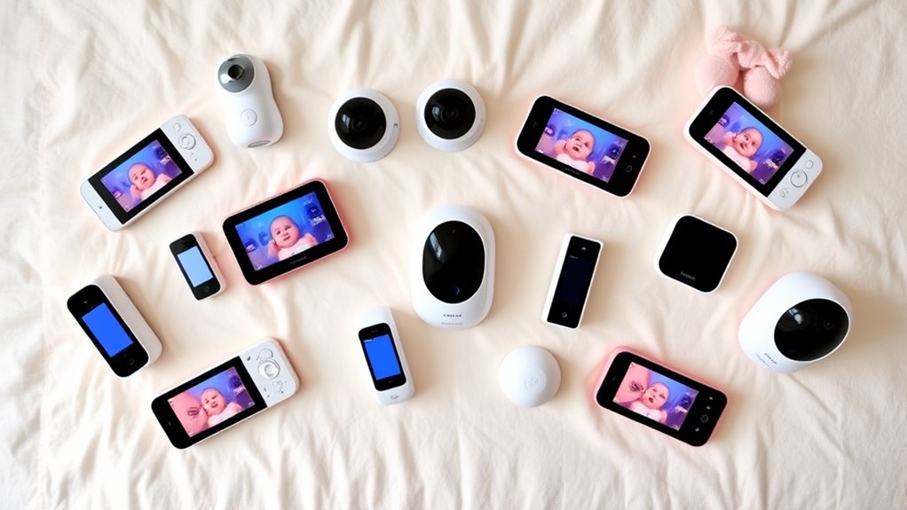 As I explore baby monitors, the connectivity options available play a crucial role in my decision-making process. I find that most smart monitors support Wi-Fi, allowing me to access them remotely via smartphone apps. I appreciate models with dual-band capabilities, like 2.4 GHz and 5 GHz, for stable streaming. Some monitors even offer dual connectivity modes, combining Wi-Fi with local connections for enhanced security. I also like the Bluetooth pairing feature for quick setups. Additionally, having options for cloud storage or local microSD recording is useful, though it requires internet access. Ultimately, the connectivity choices greatly affect range, security, and reliability, ensuring I can monitor my baby effectively, even offline when needed.