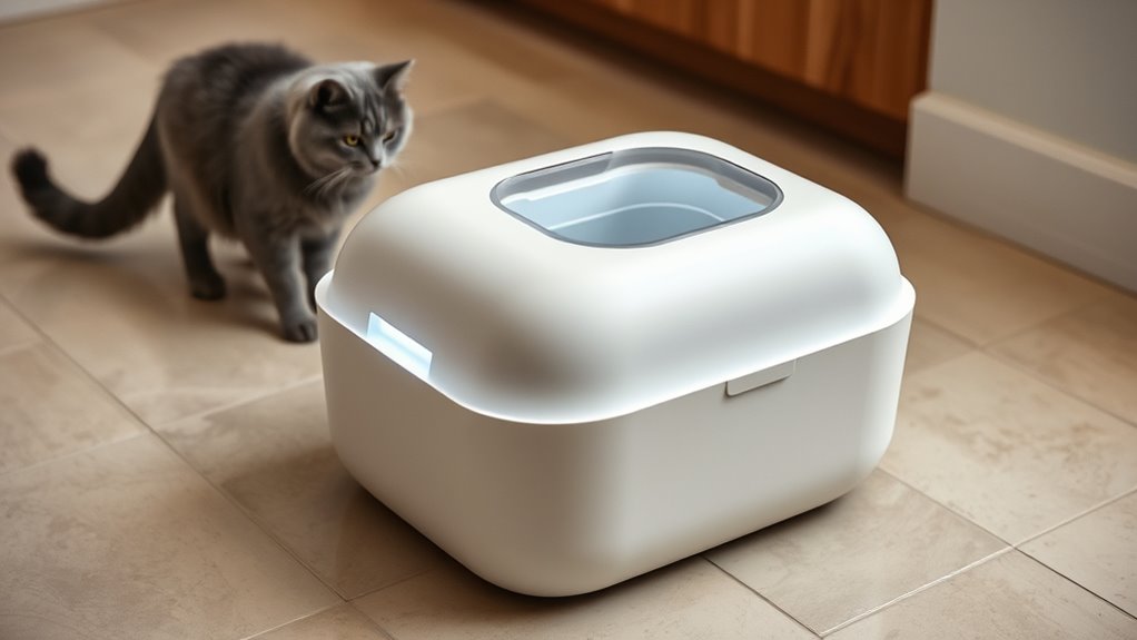 Since cats can be sensitive to loud noises, paying attention to the noise levels of a smart litter box is vital. Most models operate around 35 dB, similar to a refrigerator, guaranteeing minimal disturbance. Some are even quieter, at about 20 dB, providing a near-silent cleaning process that’s ideal for sensitive cats and quiet household environments. Higher noise levels can scare cats away from the litter box, leading to accidents or behavioral issues. Quiet operation is especially essential at night or in multi-cat homes, where disturbances can cause stress. When choosing a smart litter box, check the product specifications for noise levels to make sure you select an option that keeps your cats comfortable and stress-free during their bathroom routine.