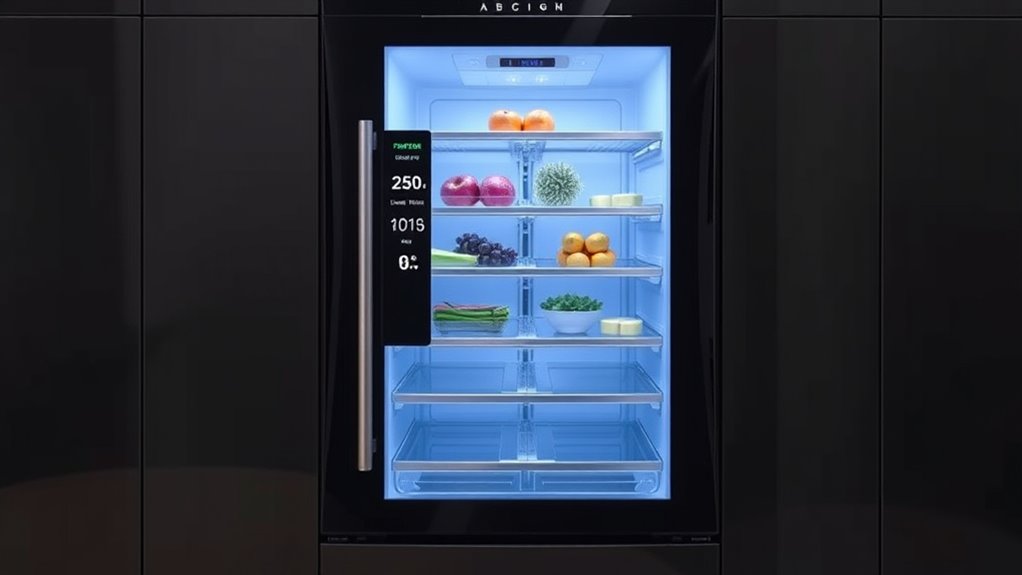 Privacy and security are crucial considerations because smart refrigerators with touch screens handle sensitive personal data. Many models use encrypted Wi-Fi and Bluetooth to protect your information from unauthorized access. Advanced security features like multi-factor authentication and user access controls help prevent unauthorized device pairing and remote access. Manufacturers often release regular firmware updates to fix vulnerabilities and boost privacy protections. Some refrigerators come with privacy screens or disable remote features by default, giving you control over data sharing. It’s important to understand what data is collected, such as usage patterns or voice recordings, and ensure it’s transparently disclosed and securely stored. Prioritizing these measures helps safeguard your privacy while enjoying the convenience of smart technology.