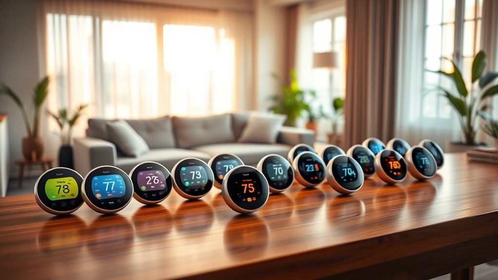 If you’re looking for the best smart thermostats of 2025, I recommend checking out models like the ecobee Smart Thermostat Premium and the Google Nest Learning Thermostat. These smart devices offer significant energy savings, compatibility with most HVAC systems, and user-friendly features like programmable schedules and remote control. Their sleek designs and advanced capabilities really optimize comfort and efficiency in the home. Keep exploring to discover more options and features that suit your needs!