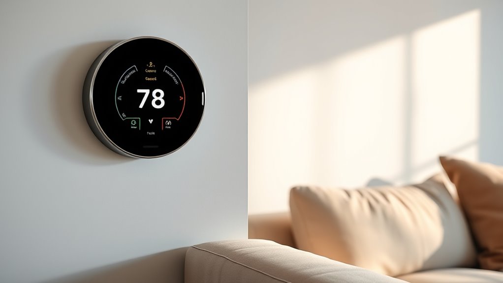 Have you considered how much energy you could save with a smart thermostat that learns your habits? These devices can cut your energy bills by 12-26% annually by adjusting heating and cooling based on your routines. Their learning algorithms optimize HVAC operation by preheating or precooling your home, reducing waste during unoccupied times. Many models monitor occupancy and automatically adapt temperatures when you’re away or asleep, preventing unnecessary energy use. Features like eco modes and adaptive scheduling help maintain comfort while lowering overall consumption. Additionally, usage reports and energy history allow you to identify patterns and fine-tune your settings for maximum efficiency. This combination of intelligent adjustments and data insights makes smart thermostats a powerful tool for saving energy and money.