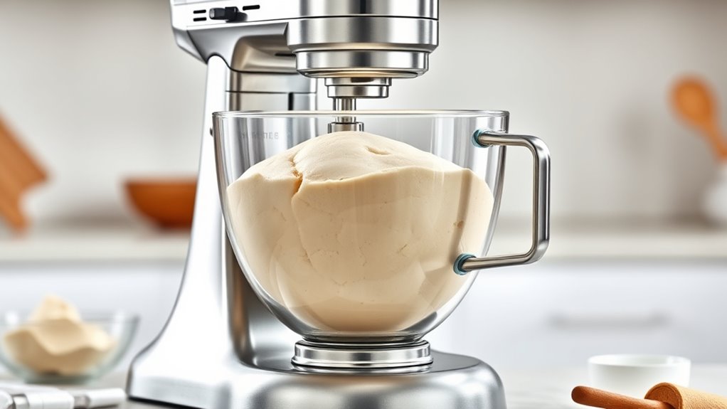 Since versatility is key in a stand mixer for bread dough, it’s important to contemplate the range of attachments available. A variety of tools like dough hooks, whisks, and flat beaters allow you to handle different baking tasks efficiently. The ease of switching attachments speeds up multi-step recipes, reducing the need for extra appliances. Compatibility with specialized accessories such as pasta rollers or bread shaping tools can further expand your mixer’s capabilities beyond basic mixing. Durable, dishwasher-safe materials in attachments make cleaning straightforward and guarantee longevity. Additionally, a stand mixer with multiple speed settings and accessory options provides better control over mixing intensity and consistency, which is essential for perfect bread dough. Overall, versatility in attachments enhances your baking experience and results.