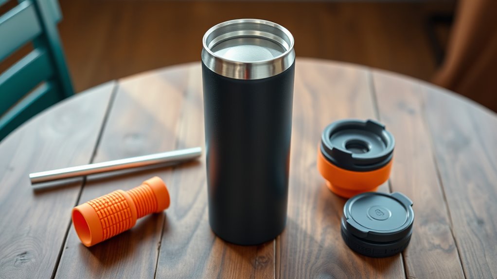 They say “you are what you drink,” and yes, accessories can influence your tumbler’s temperature retention. While the tumbler’s core insulation is key, adding accessories like silicone sleeves or lids can slightly impact heat retention, either positively or negatively. I’ve found that keeping accessories snug and minimal helps maintain temperature longer, so choose wisely. Ultimately, the tumbler’s design plays the biggest role, but accessories can enhance your overall experience.