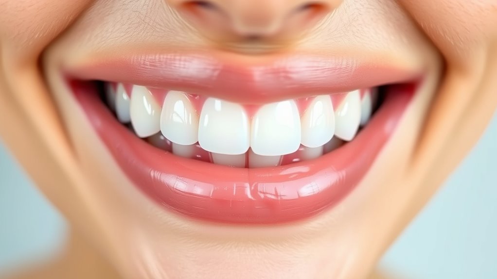 Selecting teeth whitening strips that offer comfort during application is vital, especially for sensitive teeth. Look for strips with non-slip technology and moisture-activated gel to guarantee they stay securely in place without slipping, reducing frustration. Ultra-thin, dissolvable materials that conform to your teeth provide a more comfortable fit, minimizing irritation. Products designed specifically for sensitive teeth often feature reduced peroxide levels or enamel-safe ingredients, making the experience gentler. Ergonomic, contoured shapes help the strips stay in place naturally, avoiding discomfort or irritation. Additionally, clear instructions on application duration are essential—they prevent overuse and help minimize sensitivity. Prioritizing these factors ensures a more comfortable, effective whitening process tailored to sensitive teeth.