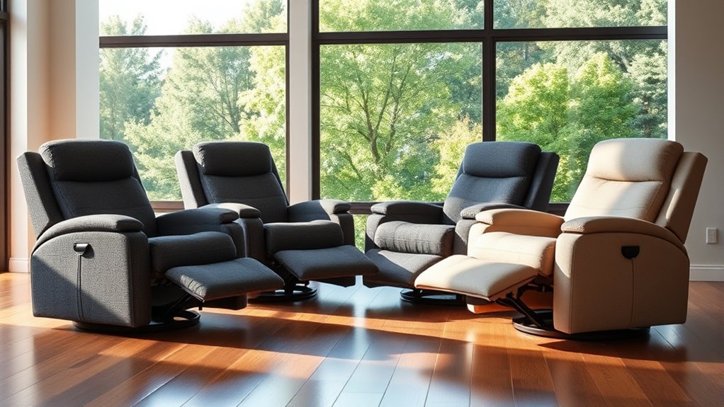 Adjustable features in zero-gravity recliners play a vital role in customizing your relaxation experience. Many models come with motorized backrests, footrests, and headrests, allowing for personalized comfort at the push of a button. These recliners often offer multiple reclining positions, sometimes with infinite adjustments, so you can find that perfect zero-gravity angle. Power controls ensure smooth, one-touch adjustments, making it easy to achieve ergonomic positioning. Some chairs let you independently control the headrest and leg rest, giving you flexibility for activities like reading, napping, or watching TV. Features like tilt-lock, zero-gravity positioning, and height modifications further enhance support and relaxation, letting you tailor the recliner to your unique needs. These adjustable features make relaxation effortless and fully customizable.