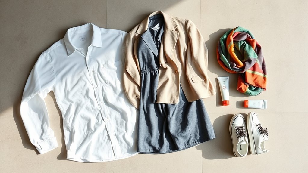 To pack efficiently for a trip, I focus on selecting pieces that are lightweight and wrinkle-resistant, making them easy to roll or fold into compact bundles. Versatile clothing that can be styled in multiple ways helps me cut down on the number of items I bring, simplifying my packing process. Quick-drying fabrics are a game-changer, allowing me to do laundry on the go without hassle. Packing cubes and organizers keep everything neat, accessible, and minimize bulk, making unpacking effortless. I also choose pieces that retain their shape and color after washing, so I can reuse them confidently during extended trips. This approach not only saves space but also reduces stress, ensuring I stay organized and prepared without overpacking.