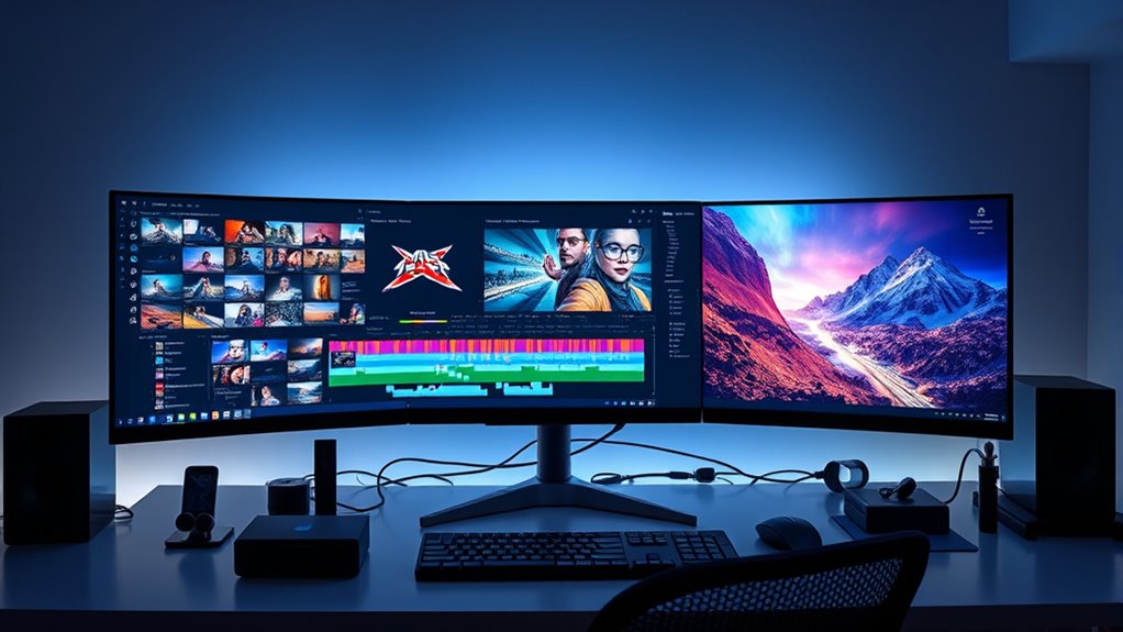 Color accuracy and gamut coverage are vital considerations after selecting the right screen size and resolution, especially for video editing where true-to-life colors make all the difference. A monitor with a wide color gamut, like 100% sRGB or AdobeRGB, guarantees you see a broader spectrum of colors, essential for precise editing. Factory calibration with Delta E values below 2 assures high color accuracy out of the box, reducing the need for manual adjustments. Supporting professional color spaces such as Rec. 709 and DCI-P3 aligns your work with industry standards. Monitors with 8-bit or 10-bit color depth provide smoother gradients and minimize banding. Additionally, calibration tools like Calman or X-Rite help maintain consistent, accurate colors over time, guaranteeing your projects always look their best.