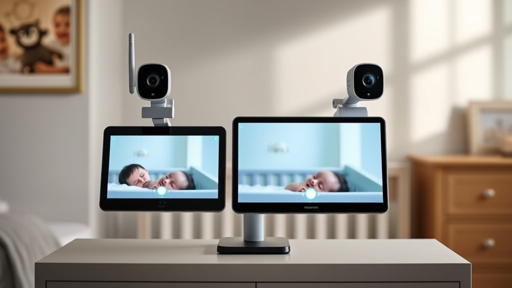 Dual cameras improve baby monitoring safety by giving me a complete view of my baby’s room from different angles. I can watch both the crib and the play area simultaneously, ensuring I catch any unusual movements or sounds quickly. This setup reduces blind spots, so I always stay informed. It’s like having two eyes on my little one, providing extra reassurance and peace of mind whenever I need to check in.