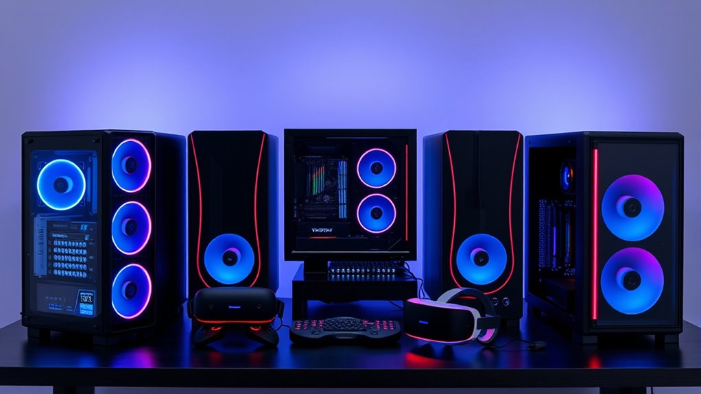 To enjoy a truly immersive VR experience, your desktop’s performance capabilities are crucial. A high-performance GPU, like an NVIDIA GeForce RTX 5070 or equivalent, ensures smooth rendering of virtual environments without lag. The CPU should be a multi-core processor such as an Intel Core i7-13700F or AMD Ryzen 7, capable of handling real-time data processing efficiently. At least 16GB of DDR5 RAM is necessary to support multitasking and maintain high frame rates during demanding VR sessions. Fast data transfer interfaces, like PCIe 4.0 NVMe SSDs, enable quick load times and seamless handling of large VR assets. Additionally, a robust cooling system and power supply are indispensable to sustain these components during extended use, preventing overheating and performance drops.