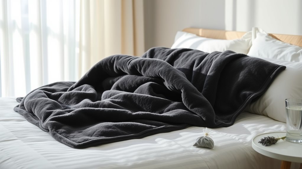 Are you aware of how your blanket’s material influences your sleep temperature? Choosing a breathable fabric like cotton or bamboo can help prevent overheating, keeping you comfortable throughout the night. If you tend to sleep hot, opt for blankets with moisture-wicking covers or those designed with cooling features, which are great for temperature regulation. Avoid overly heavy or dense blankets that trap heat, especially in warmer environments, as they can lead to discomfort. Matching the blanket’s weight and fabric to your usual sleep temperature preferences is essential for maintaining comfort. A well-chosen material helps you stay cool when needed and warm enough when it’s chilly, ensuring your weighted blanket supports both your anxiety relief and restful sleep.