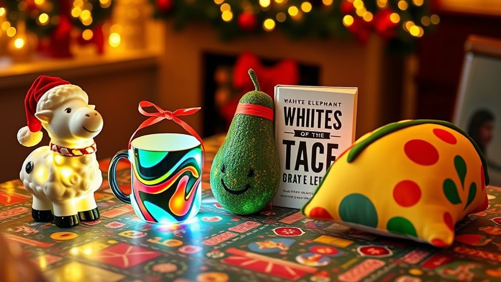 Standing out in a sea of generic gifts is essential if you want your white elephant offering to be remembered, and that’s where uniqueness comes into play. A one-of-a-kind gift captures attention and leaves a lasting impression. Incorporating humor, novelty, or unexpected elements can spark conversations and make the gift more memorable. Personalized or customized items add a thoughtful touch that shows extra effort and makes the recipient feel special. Choosing gifts aligned with their interests or hobbies creates meaningful, fun experiences. Creative presentation or packaging can elevate even simple items, making them feel more special and unforgettable. Ultimately, selecting something distinctive ensures your gift won’t get lost in the crowd, making it the highlight of the exchange. It’s all about making your gift stand out and be remembered.
