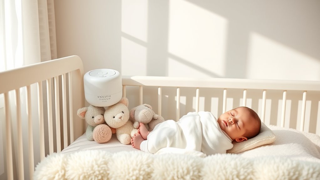 Choosing the right white noise machine is like finding a gentle lighthouse in a storm—guiding your little one to calm, restful sleep amid life’s chaos. Whether you opt for a soothing lullaby or a soft hum, these machines can transform bedtime into a peaceful harbor. Trust your instincts and pick the one that feels like a warm embrace, helping your baby drift into dreams as serene as a moonlit night on calm waters.