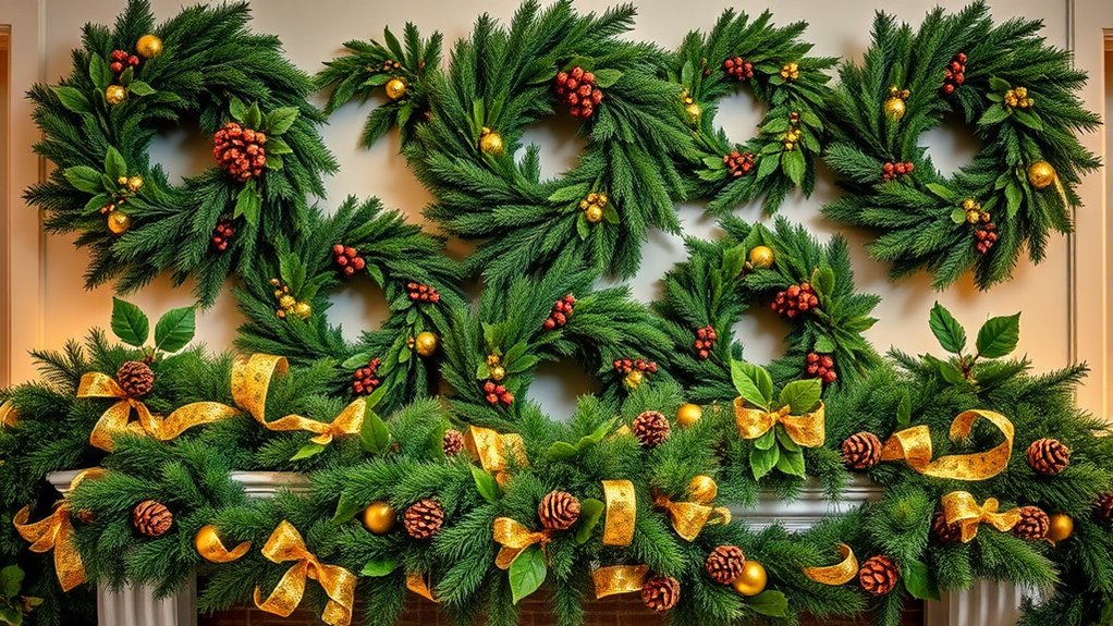 If you’re looking to elevate your holiday decor, the best wreaths and garland sets combine realistic greenery, quality craftsmanship, and versatile styles perfect for mantels. Options like eucalyptus, fall leaves, and floral designs in various sizes—ranging from 20 to 26 inches—offer both durability and a full, lush appearance. Many are weather-resistant and easy to customize with ribbons or ornaments. Keep in mind your space, decor style, and whether you prefer seasonal or all-season pieces—exploring more will help you find the perfect match.