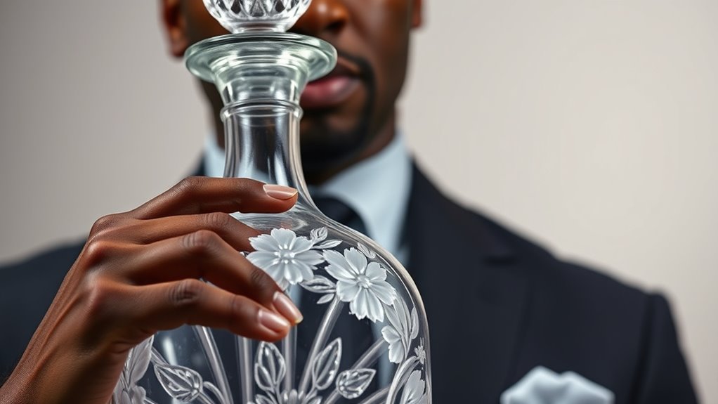 The materials used in crafting the decanter are as luxurious as a jewel box. You’ll find finely crafted crystal, renowned for its clarity and brilliance, combined with delicate Lalique glasswork that adds an artistic touch. The decanter also features metal accents, possibly platinum or silver, to enhance its elegance. Each piece is meticulously designed, making it not just a container but a true work of art meant to turn heads and elevate your collection.