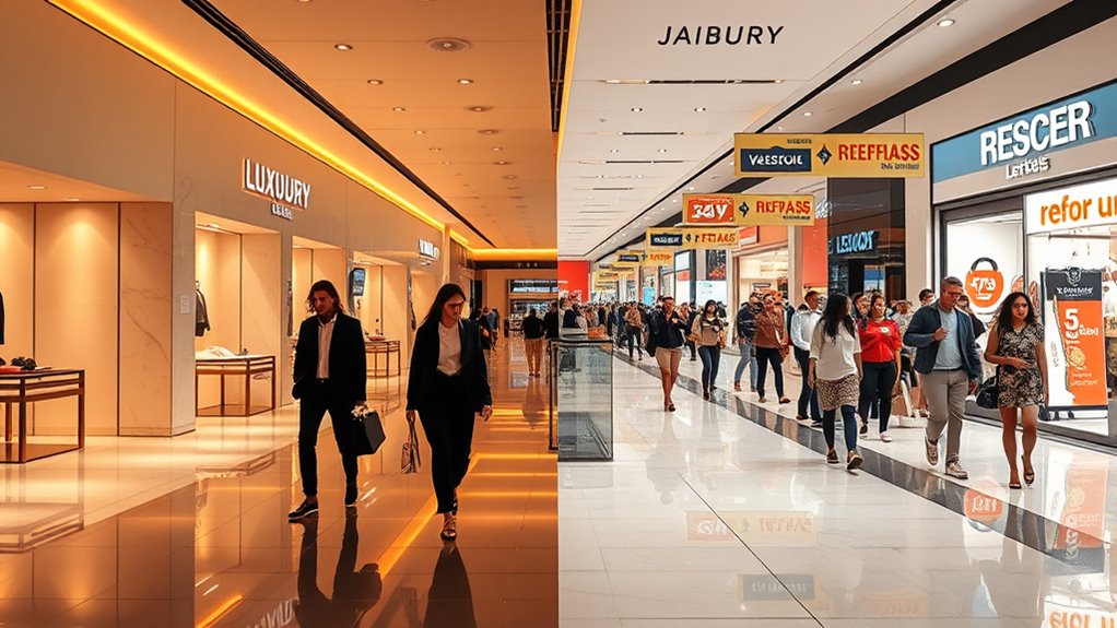 In today’s economy, a K-shaped split favors resilient luxury brands by allowing them to thrive as their wealthy customers continue investing in high-end goods and experiences. Meanwhile, many consumers tighten their budgets and cut back on discretionary spending. This divide highlights how affluent groups maintain or even increase their spending, supporting luxury’s strong performance. If you want to understand how this split impacts the market and what it means for consumers, there’s more to explore.